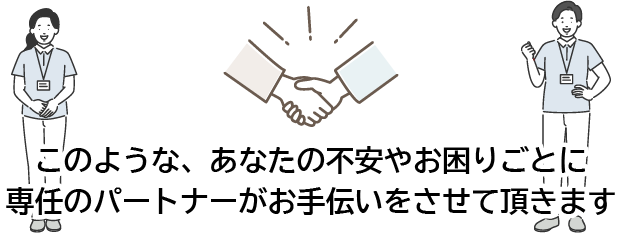 病院受診の付き添いや買い物の付き添いなど、日常生活で起こるご不便なことや不安なことをサポートさせていただきます。